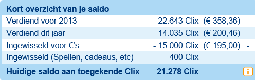 Nadat ik begonnen was, was ik dus via PanelClix 310 'Clix' rijker. Maar wat is nu een Clix waard?Om een lang verhaal kort te maken: Uit een of ander schema leerde ik dat 1000 Clix gelijkstaat aan 10 euro. Maar: Hoe langer je spaart, hoe meer de Clix waard zijn, met een maximum van 850 euro voor 50.000 Clix. Oftewel: 1 Clix = 0,017 euro.